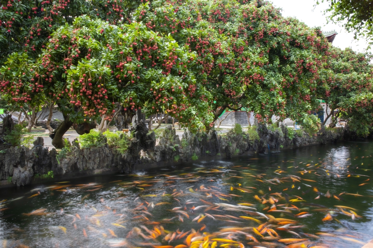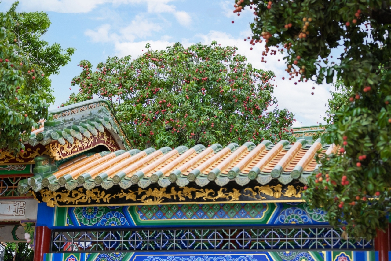 宝墨园内百余株百年古荔迎来丰收季,朱丹彤彤的果实与青砖灰瓦、亭台楼阁相映成趣。